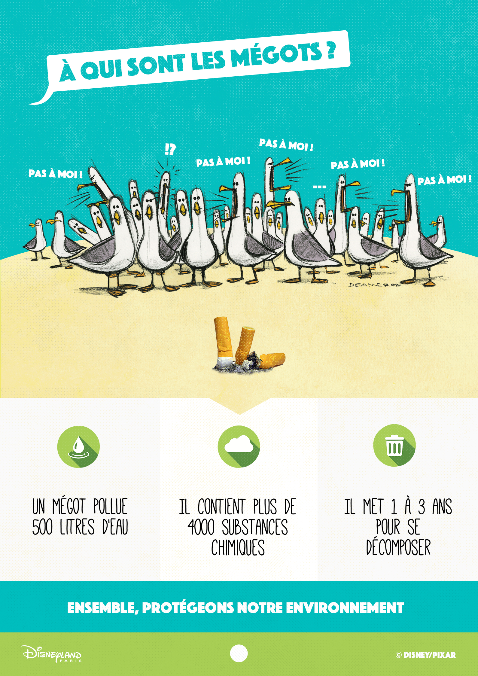 En 2016, un de mes chefs d’équipe m’a demandé de collaborer à une campagne, en coulisses, contre les mégots. Je voulais jouer avec le grand nombre de franchises que nous avons dans The Walt Disney Company. Au final, c’est devenu un jeu de mots avec les célèbres mouettes de “Le Monde de Nemo”.